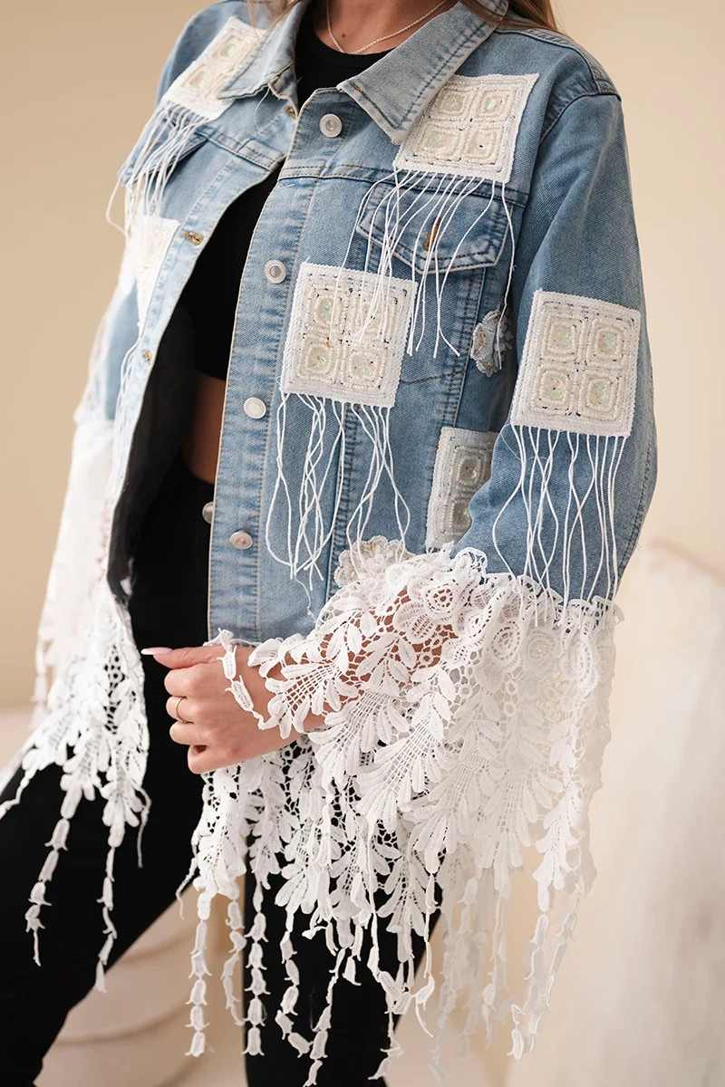 Tato jedinečná džínová bunda je skutečným klenotem v boho stylu! Ozdobená krajkovými vložkami, třásněmi a vyšívanými čtverci, přitahuje pozornost a dává každému outfitu unikátní charakter. Třásně a jemná krajka v dolní části bundy a na rukávech dodávají lehkost a ženské kouzlo, zatímco etno aplikace podtrhují umělecký styl celku.