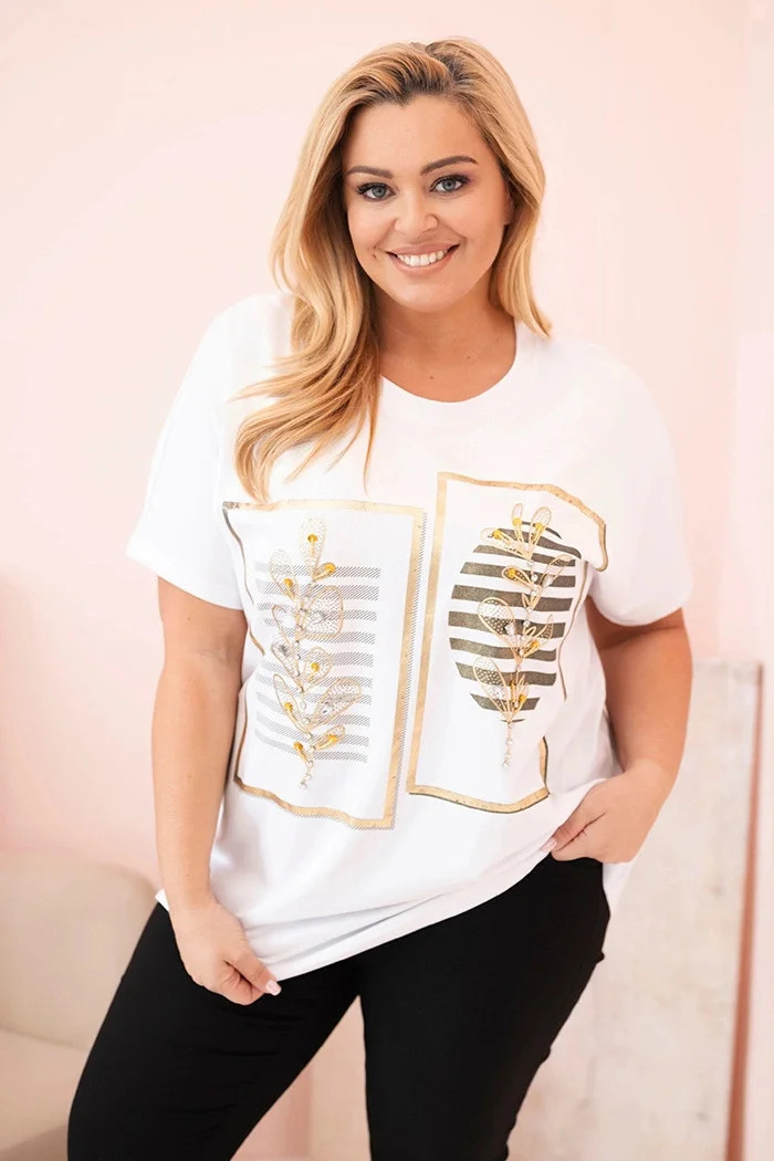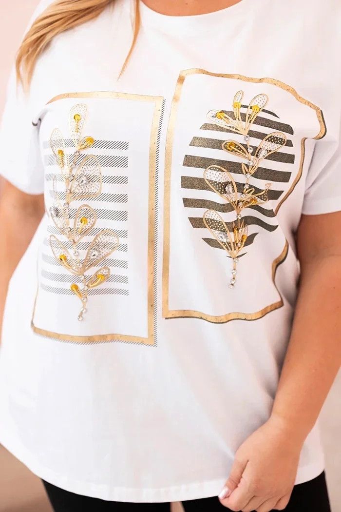 Tato dámská halenka s krátkým rukávem je ideální volbou pro ženy, které si cení pohodlí a stylového vzhledu na každý den. Její volný střih typu oversize skvěle padne na postavu a zajišťuje naprostou volnost pohybu. Ozdobný potisk s motivem listů ve zlatém provedení, doplněný o jemné kamínky a kontrastní pruhy, dodává halence módní a poutavý charakter. Halenka je skvělá jak pro každodenní nošení, tak i na setkání s přáteli nebo víkendové vycházky. Měkký materiál s převahou bavlny je příjemný na dotek a prodyšný, což zajišťuje vysoký komfort nošení i po celý den. Univerzální střih se hodí k legínám, džínům i sukním. Model je určen pro ženy, které nosí velikosti Plus Size – XXL, XXXL a větší.
