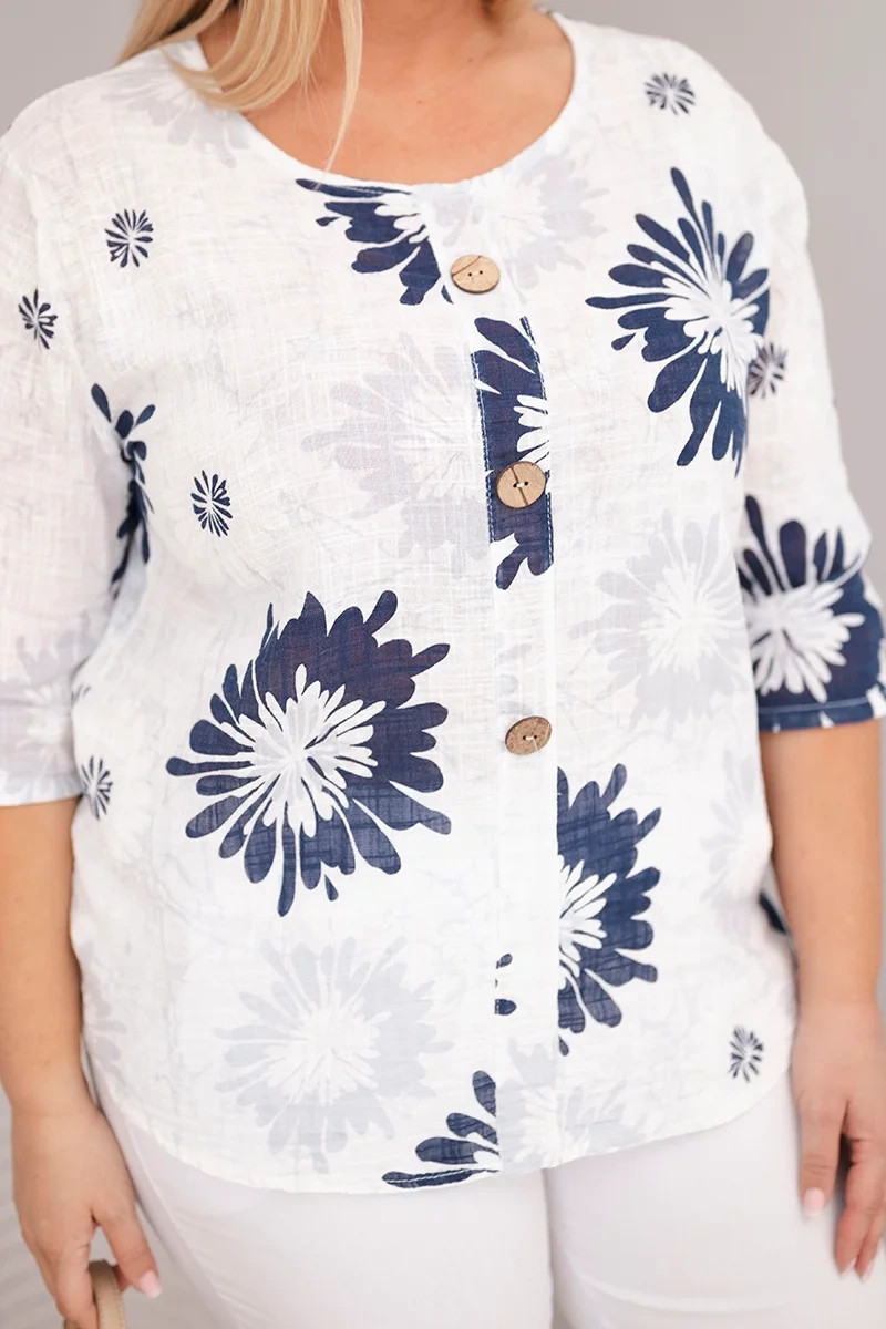 Halenka má klasický kulatý výstřih a dekorativní knoflíky vpředu, které jí dodávají jemné kouzlo. Krátký rukáv zajišťuje volnost pohybu a pohodlí i během teplejších dní. Volnější střih typu Plus Size způsobuje, že model se krásně přizpůsobí postavě a hodí se k mnoha stylizacím – jak s džínami, šortkami, tak s lehkými kalhotami nebo sukní.