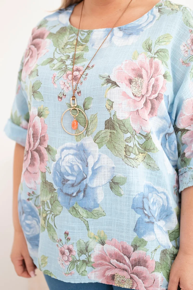 Dámská bavlněná halenka Plus Size s krátkým rukávem a květinovým vzorem modrá