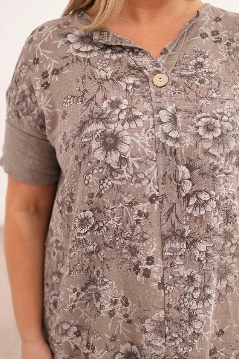 Halenka má volný střih Plus Size, který zajišťuje volnost pohybu a skvělé padnutí na různé typy postav. Kulatý výstřih s jemným rozparkem a ozdobný knoflík dodávají celku decentní eleganci. Krátký rukáv dělá model ideální volbou na léto, dovolené, procházky či každodenní nošení do práce.