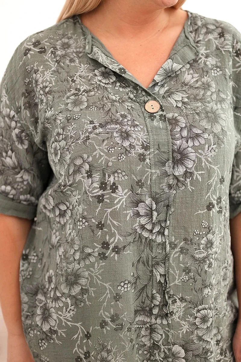 Dámská bavlněná halenka Plus Size s krátkým rukávem a ozdobným knoflíkem khaki