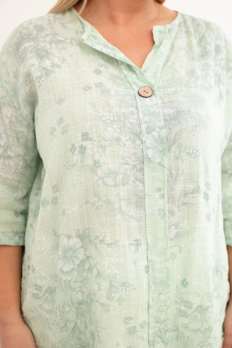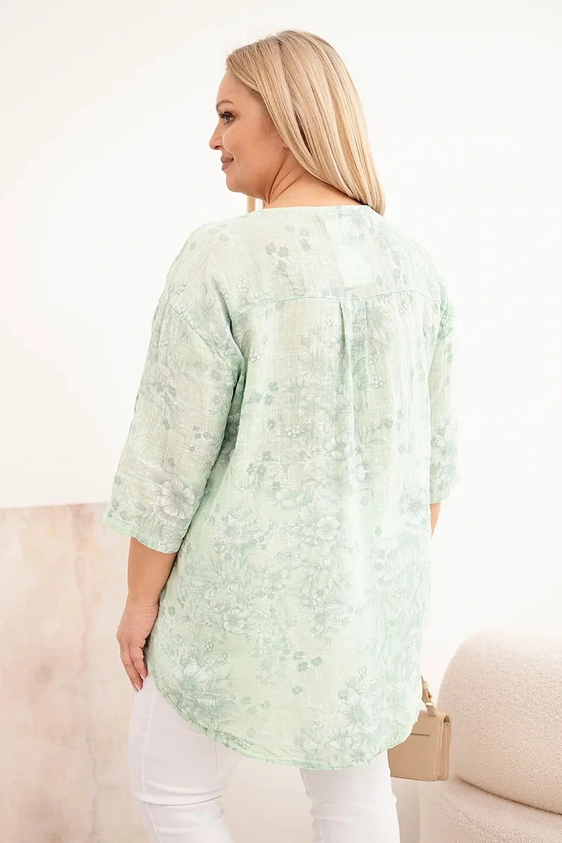Dámská bavlněná halenka Plus Size s krátkým rukávem a ozdobným knoflíkem mentolová