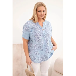 Dámská bavlněná halenka plus size s krátkým rukávem a ozdobným knoflíkem modrá