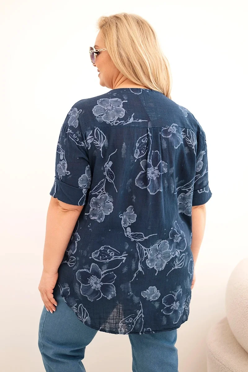 Dámská bavlněná halenka Plus Size s květinovým vzorem námořnická modrá
