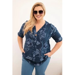 Bavlněná dámská halenka plus size se skvěle kombinuje s džínami, legínami, látkovými kalhotami nebo šortkami. Květinový motiv zdůrazňuje ženskost a dodává outfitu lehkost. Je to model, který spojuje módní design s pohodlím při nošení.
