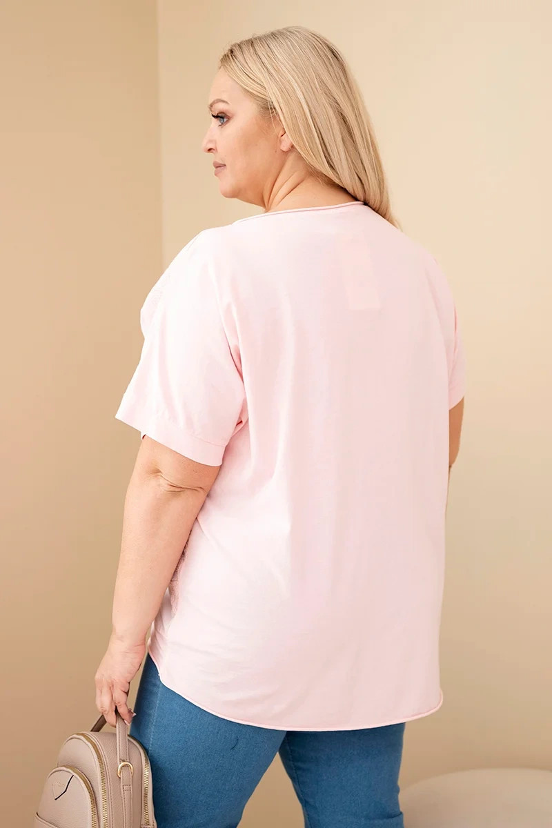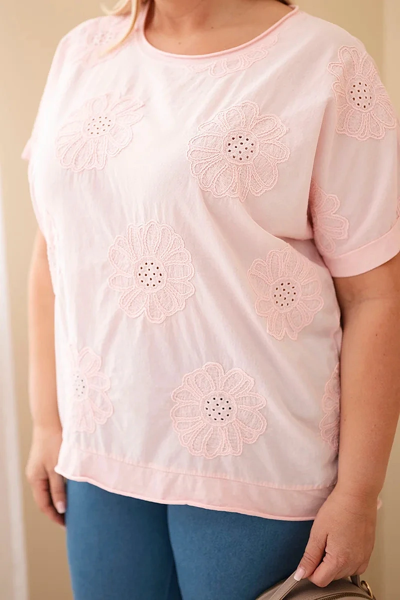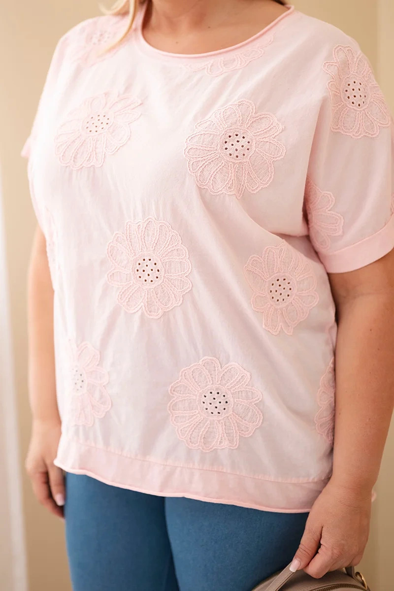 Dámská bavlněná halenka Plus Size s model 22092372 květinami cukrově růžová - K-Fashion
