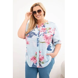 Stylová a mimořádně pohodlná dámská halenka vyrobená z přírodní bavlny je ideální volbou pro teplejší dny. Lehký, prodyšný materiál zajišťuje velmi komfortní nošení, volnější střih se krásně přizpůsobí postavě a poskytuje volnost pohybu po celý den. Model vyniká módním květinovým vzorem, který dodává outfitu ženský charakter a svěžest.