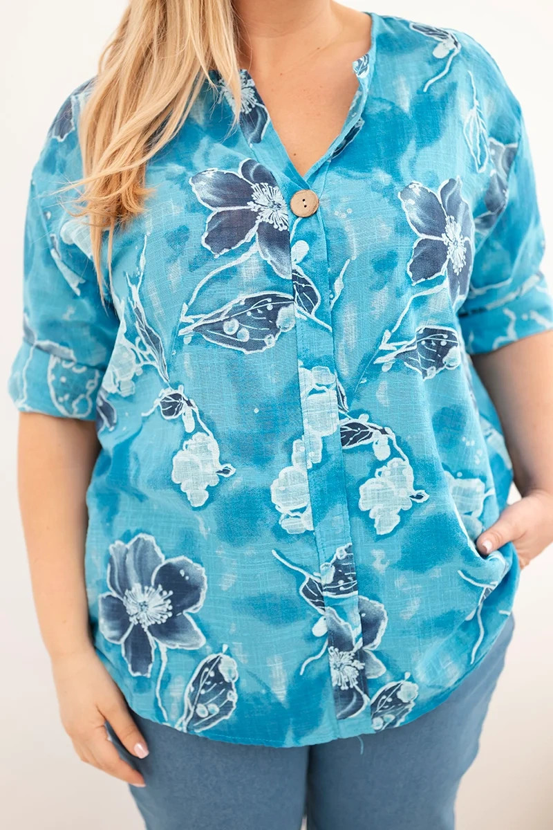 Bavlněná dámská halenka plus size se skvěle kombinuje s džínami, legínami, látkovými kalhotami nebo šortkami. Květinový motiv zdůrazňuje ženskost a dodává outfitu lehkost. Je to model, který spojuje módní design s pohodlím při nošení.