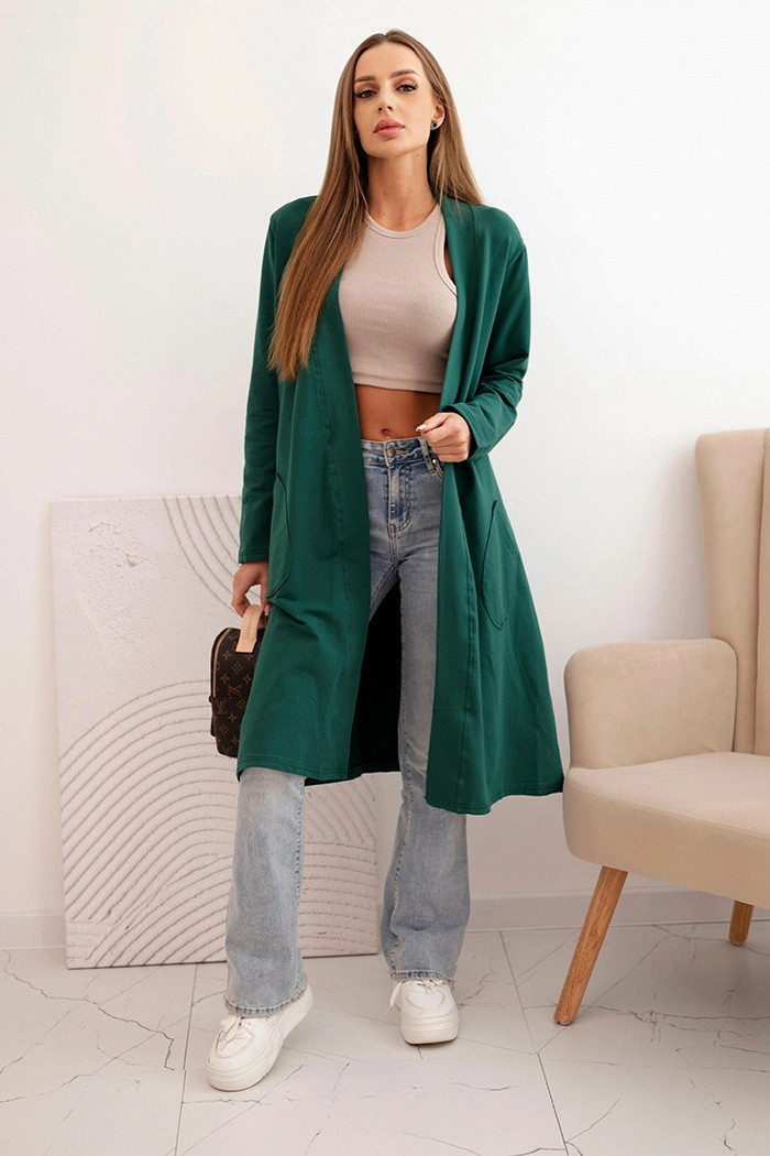 Stylová dámská cardigan s volným, prodlouženým střihem, vyrobená z měkké a elastické bavlněné pleteniny. Model bez zapínání, ideální k přehození přes top, blůzu nebo šaty. Skvěle se přizpůsobí postavě, zajišťuje komfort a volnost nošení po celý den. Univerzální střih činí cardigan vhodným pro mnoho stylizací — jak každodenních, tak i více casualových.