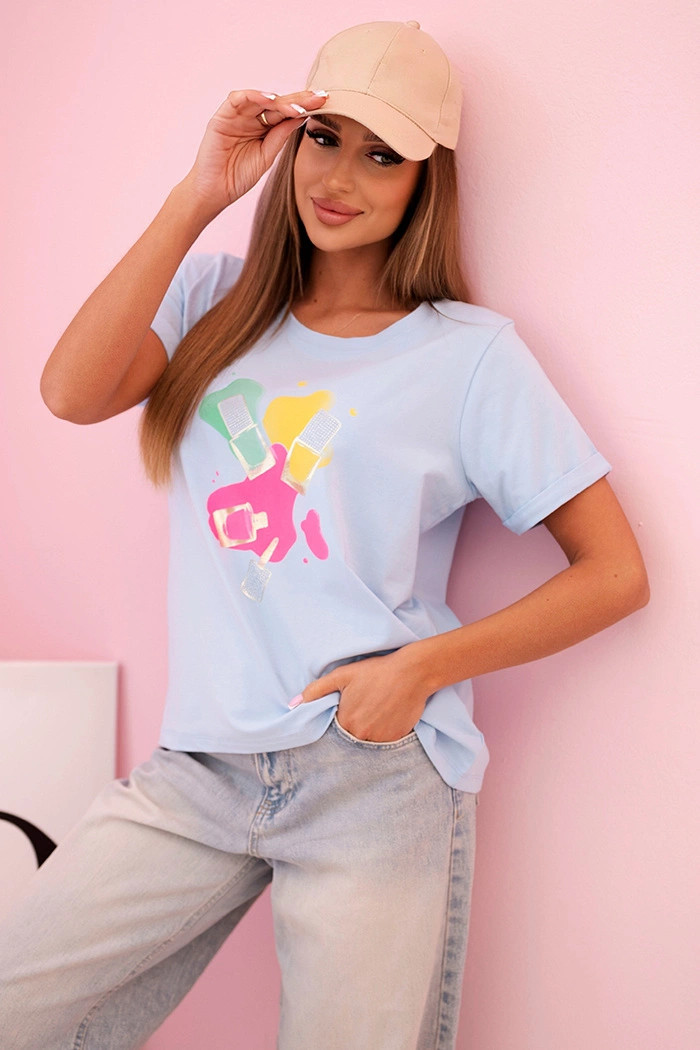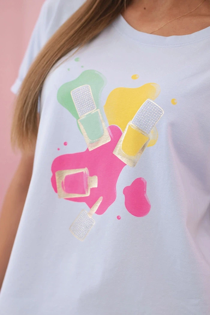 Barevný potisk ve formě laků na nehty dodává blůze dívčí, módní charakter — ideální k džínům, šortkám a sportovním stylizacím.