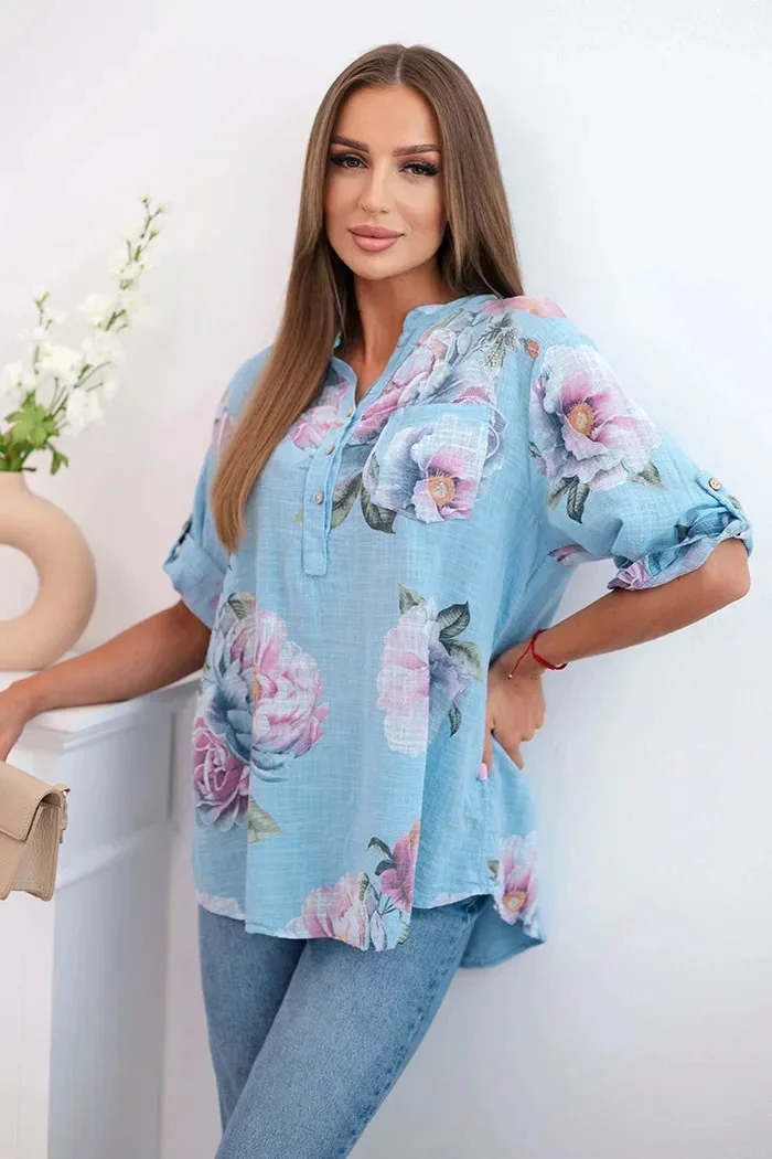 Dámská bavlněná halenka s květinovým vzorem modrý