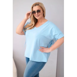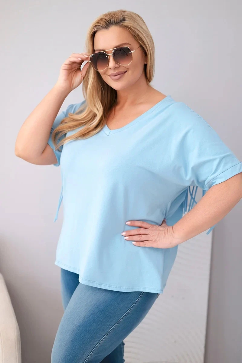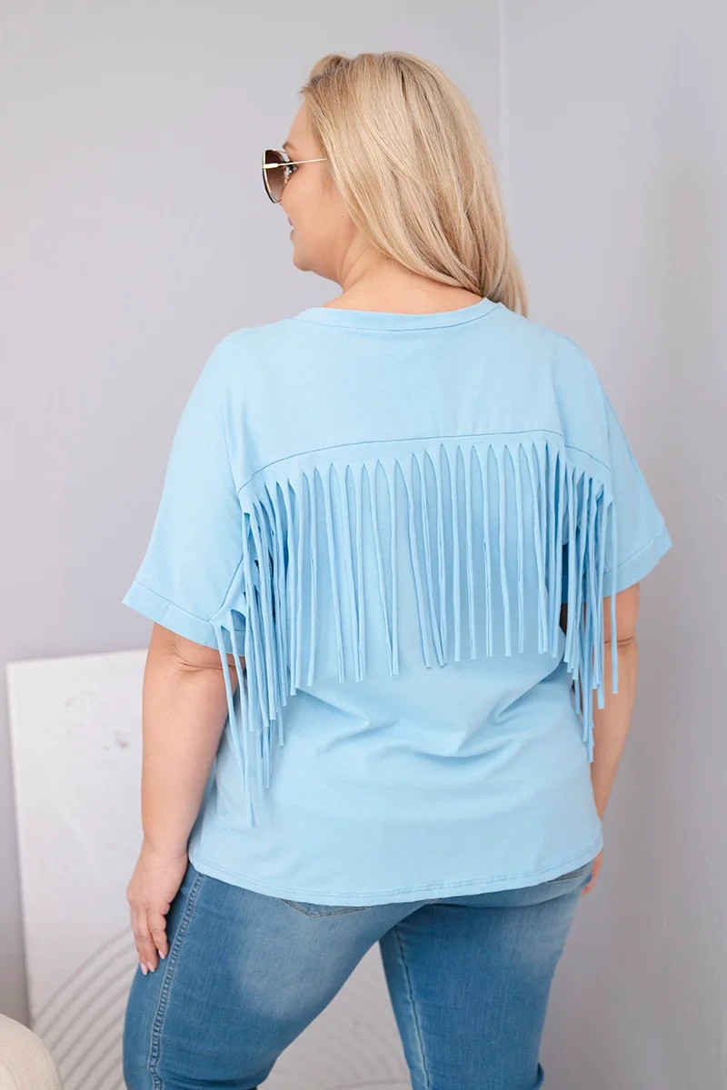 Dámská bavlněná halenka s výstřihem do V a s třásněmi na zádech modrá