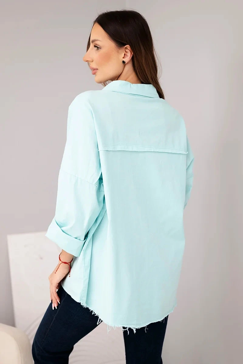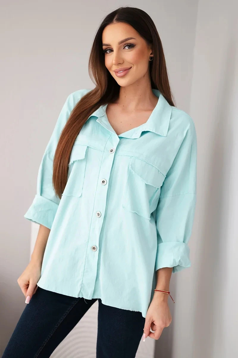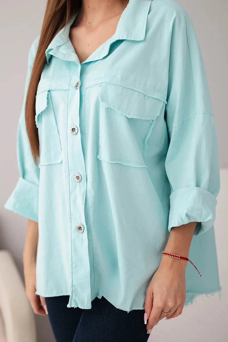 Velké našité kapsy na hrudi a syrově zakončený spodek dodávají košili módní, trochu drsný charakter. Můžete ji nosit jako lehkou bundičku nebo klasickou košili – hodí se jak k džínům, šortkám, tak k sukním. Skvělá volba na každý den, do práce nebo na výlet.