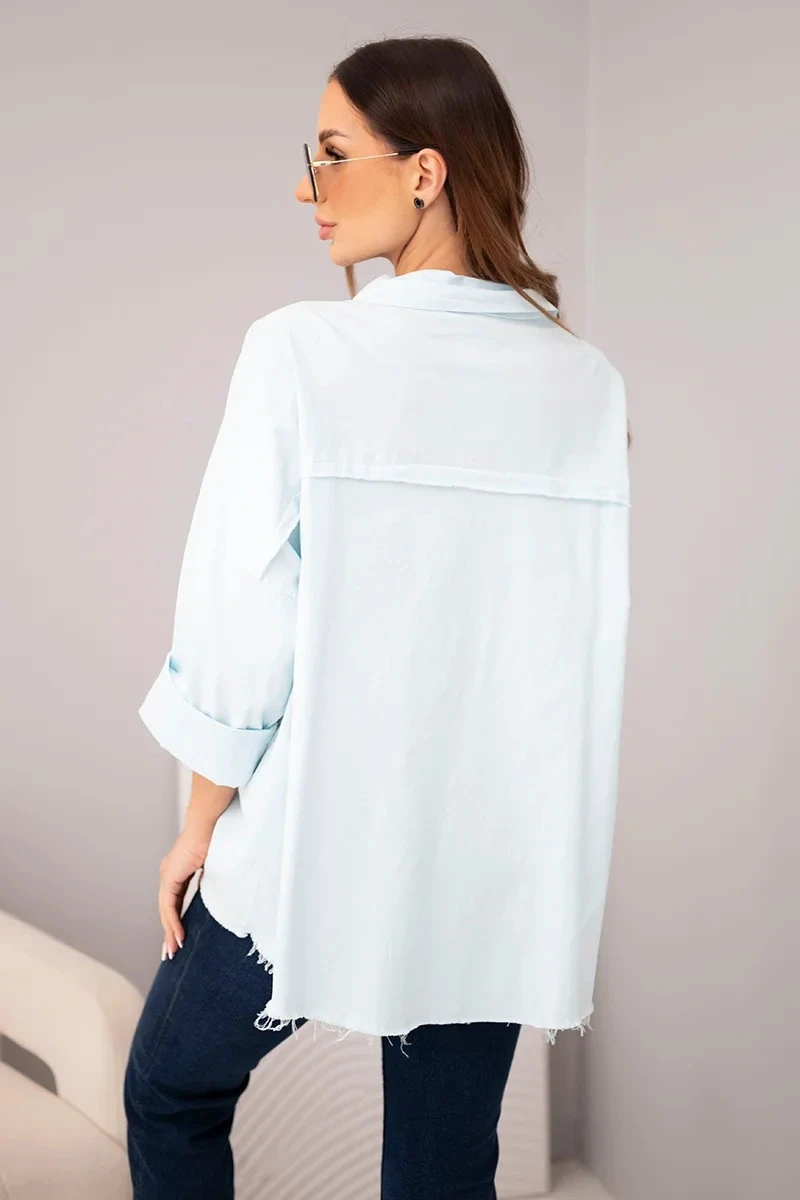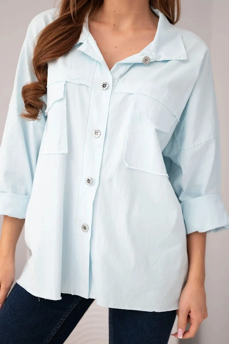 Velké našité kapsy na hrudi a syrově zakončený spodek dodávají košili módní, trochu drsný charakter. Můžete ji nosit jako lehkou bundičku nebo klasickou košili – hodí se jak k džínům, šortkám, tak k sukním. Skvělá volba na každý den, do práce nebo na výlet.