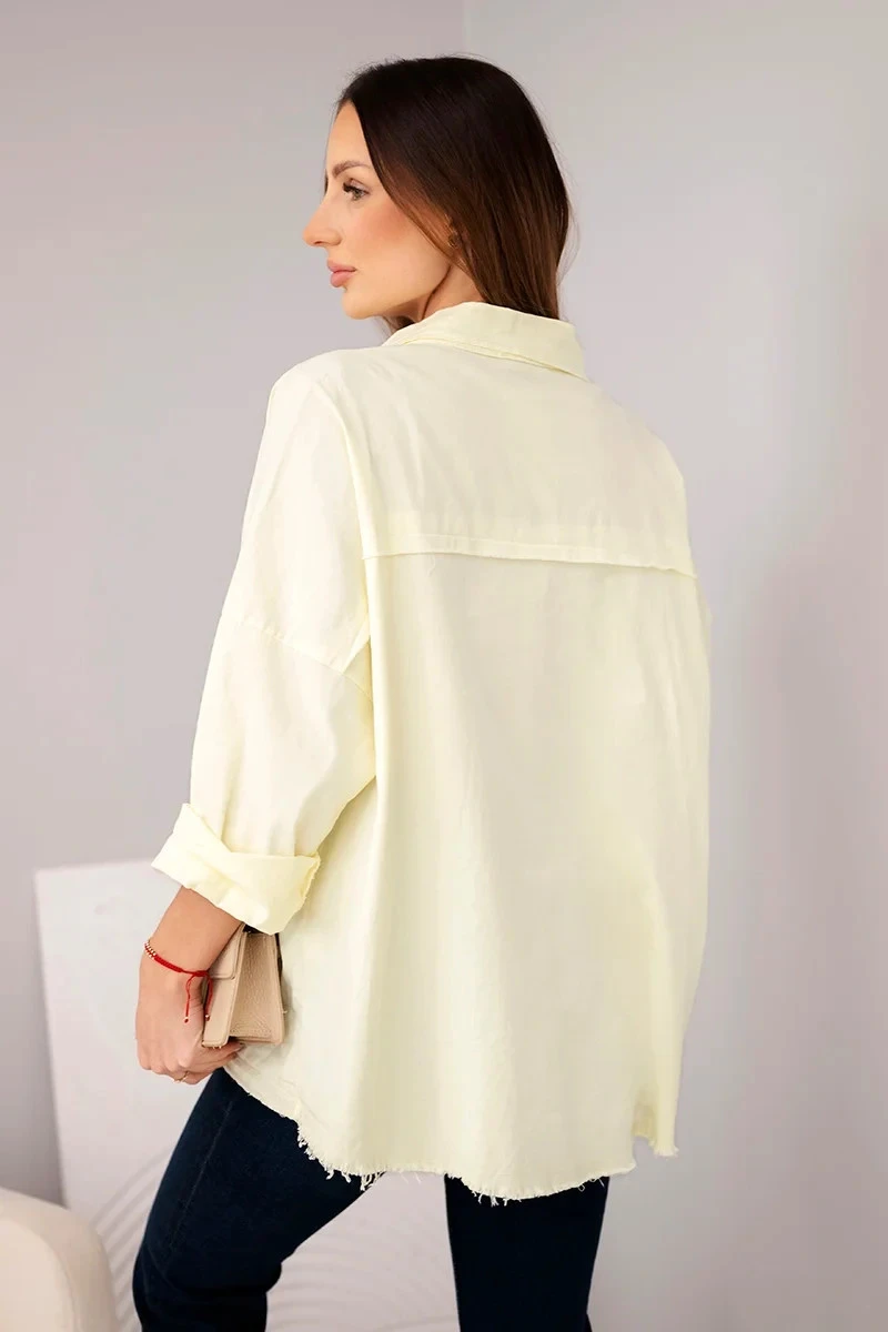Velké našité kapsy na hrudi a syrově zakončený spodek dodávají košili módní, trochu drsný charakter. Můžete ji nosit jako lehkou bundičku nebo klasickou košili – hodí se jak k džínům, šortkám, tak k sukním. Skvělá volba na každý den, do práce nebo na výlet.