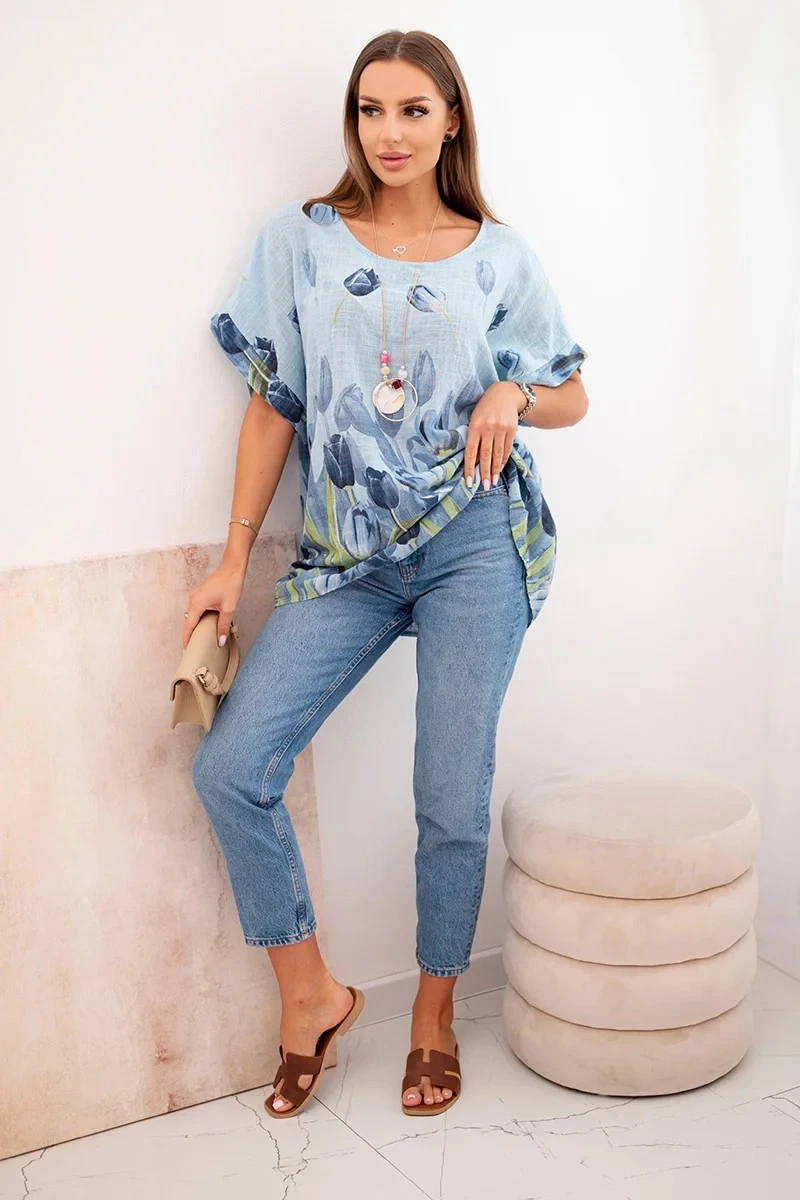 Hledáte lehkou, vzdušnou halenku ideální na teplejší dny? Tato dámská halenka s krátkým rukávem je kombinací přirozeného pohodlí a výjimečného stylu. Je vyrobena ze 100% bavlny a zaujme nejen příjemným materiálem, ale i nádherným vzorem tulipánů ve spodní části. Volný střih skvěle padne na postavu a zajišťuje plnou volnost pohybu bez ohledu na příležitost. Je to skvělá volba jak na každodenní nošení, tak i na setkání s přáteli. V kombinaci s oblíbenými džínami nebo sukní vytvoříte outfit, který upoutá pozornost. Květinový motiv jí dodává svěžest a ženský půvab, zatímco klasický lodičkový výstřih a krátké rukávy ji činí velmi pohodlnou na nošení. Velikost je univerzální a bude vyhovovat dámám velikosti S, M nebo L.