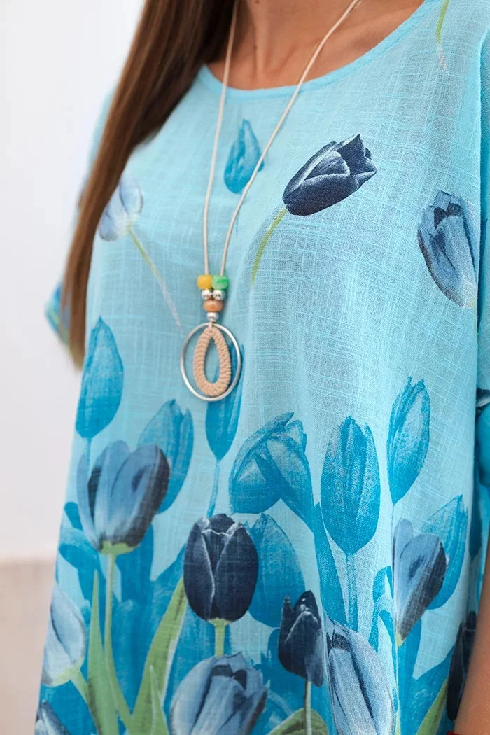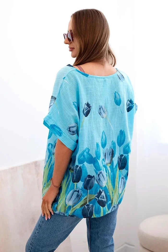 Hledáte lehkou, vzdušnou halenku ideální na teplejší dny? Tato dámská halenka s krátkým rukávem je kombinací přirozeného pohodlí a výjimečného stylu. Je vyrobena ze 100% bavlny a zaujme nejen příjemným materiálem, ale i nádherným vzorem tulipánů ve spodní části. Volný střih skvěle padne na postavu a zajišťuje plnou volnost pohybu bez ohledu na příležitost. Je to skvělá volba jak na každodenní nošení, tak i na setkání s přáteli. V kombinaci s oblíbenými džínami nebo sukní vytvoříte outfit, který upoutá pozornost. Květinový motiv jí dodává svěžest a ženský půvab, zatímco klasický lodičkový výstřih a krátké rukávy ji činí velmi pohodlnou na nošení. Velikost je univerzální a bude vyhovovat dámám velikosti S, M nebo L.