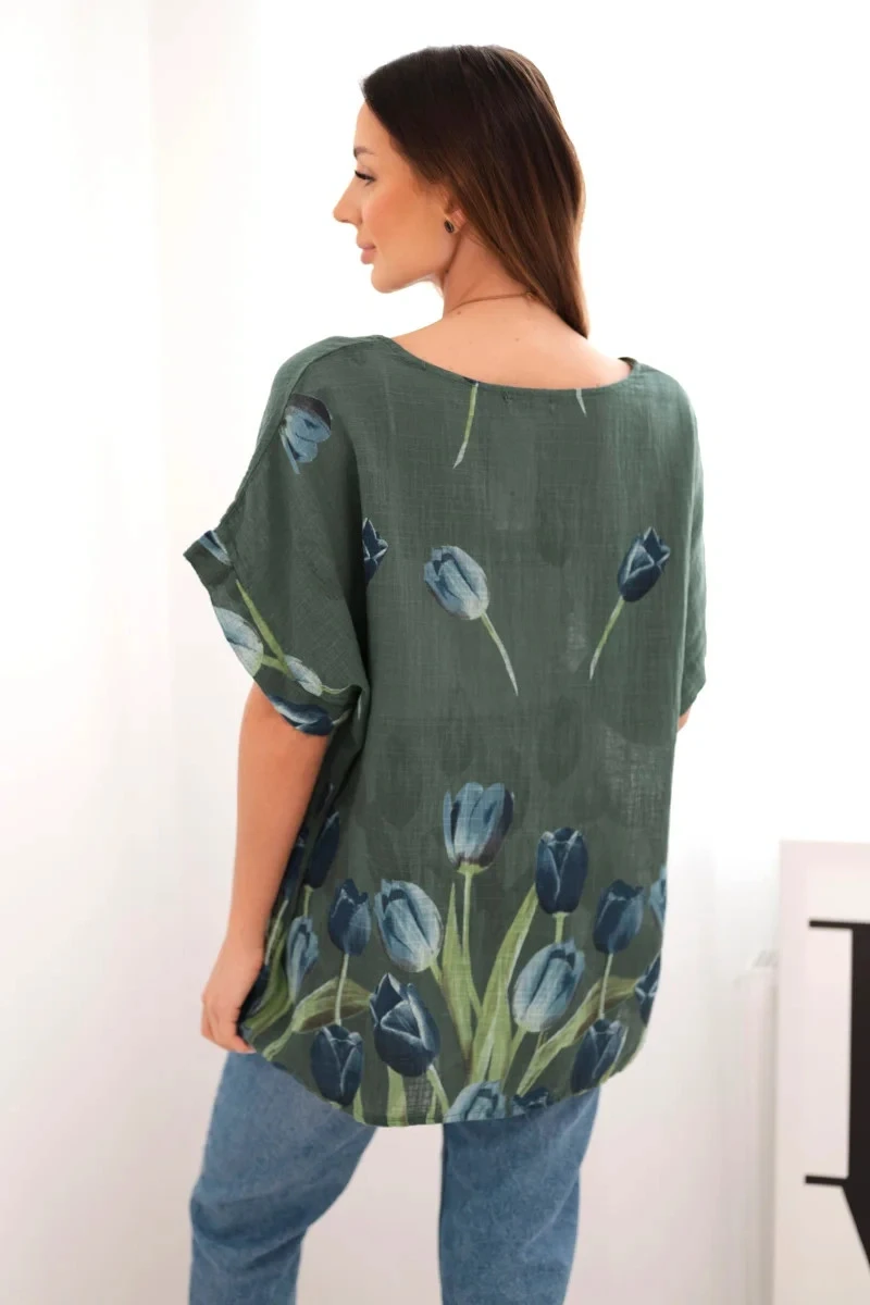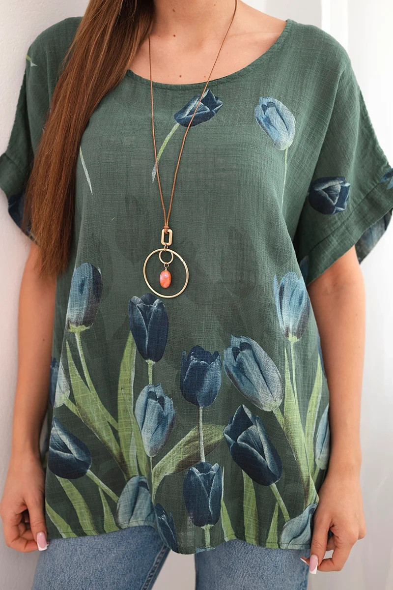Hledáte lehkou, vzdušnou halenku ideální na teplejší dny? Tato dámská halenka s krátkým rukávem je kombinací přirozeného pohodlí a výjimečného stylu. Je vyrobena ze 100% bavlny a zaujme nejen příjemným materiálem, ale i nádherným vzorem tulipánů ve spodní části. Volný střih skvěle padne na postavu a zajišťuje plnou volnost pohybu bez ohledu na příležitost. Je to skvělá volba jak na každodenní nošení, tak i na setkání s přáteli. V kombinaci s oblíbenými džínami nebo sukní vytvoříte outfit, který upoutá pozornost. Květinový motiv jí dodává svěžest a ženský půvab, zatímco klasický lodičkový výstřih a krátké rukávy ji činí velmi pohodlnou na nošení. Velikost je univerzální a bude vyhovovat dámám velikosti S, M nebo L.