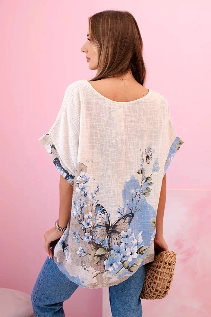 Představujeme lehkou a vzdušnou dámskou halenku s krátkým rukávem, ozdobenou romantickým potiskem motýlů a květin. Vyrobena ze 100% vysoce kvalitní bavlny, poskytuje pohodlí i v horkých dnech. Volný střih skvěle zakrývá nedokonalosti postavy a přírodní materiál umožňuje pokožce dýchat. Ideální na každodenní nošení, letní procházky nebo setkání s přáteli. Jemné barvy a subtilní vzor dodávají celku půvab a svěžest. Výroba Itálie.