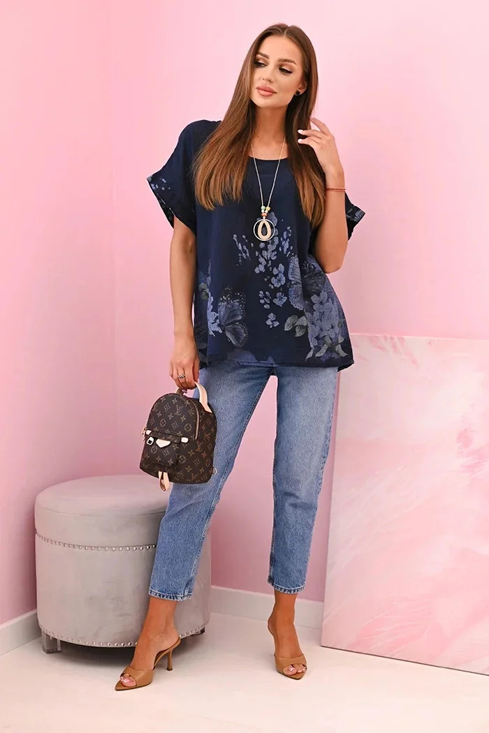Představujeme lehkou a vzdušnou dámskou halenku s krátkým rukávem, ozdobenou romantickým potiskem motýlů a květin. Vyrobena ze 100% vysoce kvalitní bavlny, poskytuje pohodlí i v horkých dnech. Volný střih skvěle zakrývá nedokonalosti postavy a přírodní materiál umožňuje pokožce dýchat. Ideální na každodenní nošení, letní procházky nebo setkání s přáteli. Jemné barvy a subtilní vzor dodávají celku půvab a svěžest. Výroba Itálie.