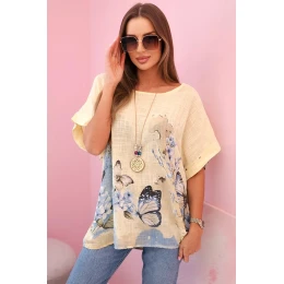 Představujeme lehkou a vzdušnou dámskou halenku s krátkým rukávem, ozdobenou romantickým potiskem motýlů a květin. Vyrobena ze 100% vysoce kvalitní bavlny, poskytuje pohodlí i v horkých dnech. Volný střih skvěle zakrývá nedokonalosti postavy a přírodní materiál umožňuje pokožce dýchat. Ideální na každodenní nošení, letní procházky nebo setkání s přáteli. Jemné barvy a subtilní vzor dodávají celku půvab a svěžest. Výroba Itálie.