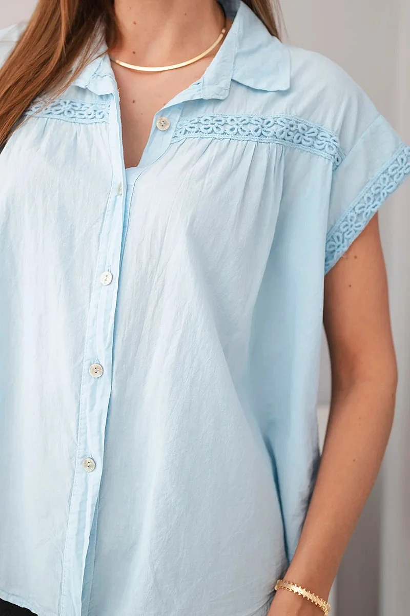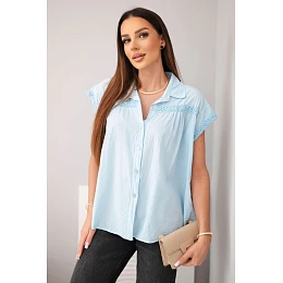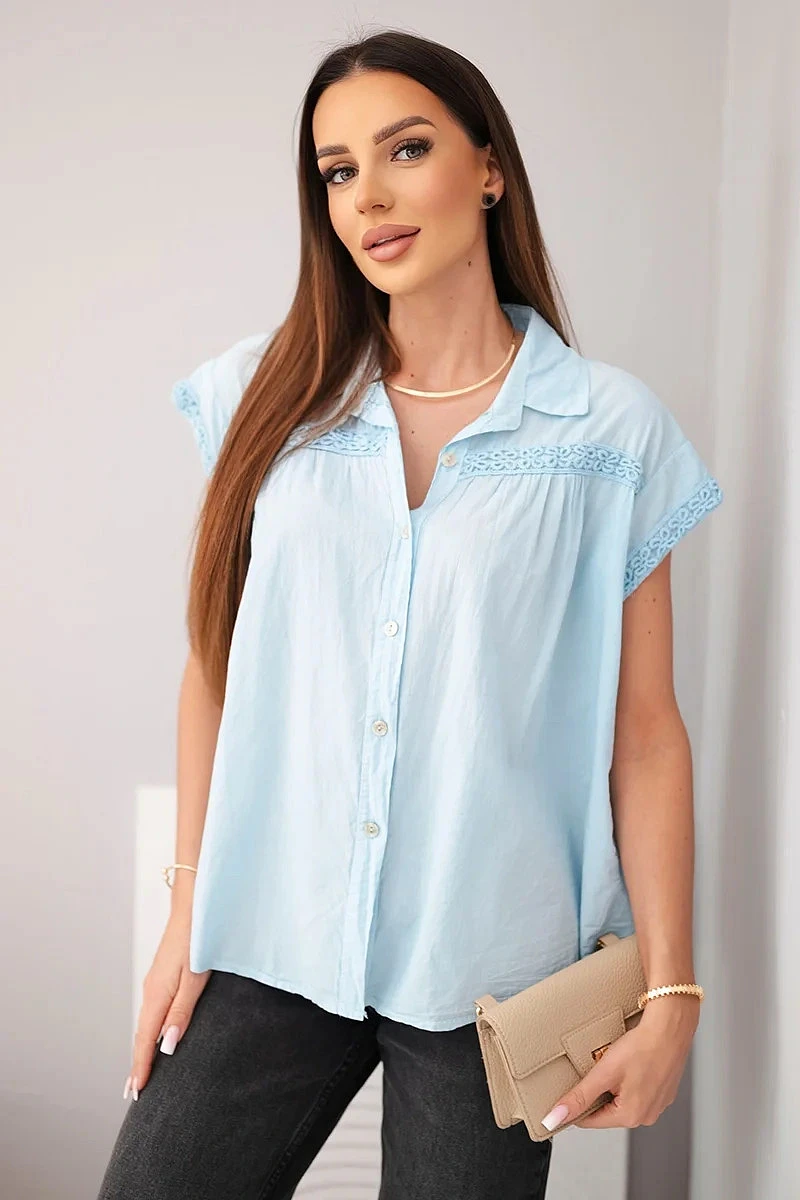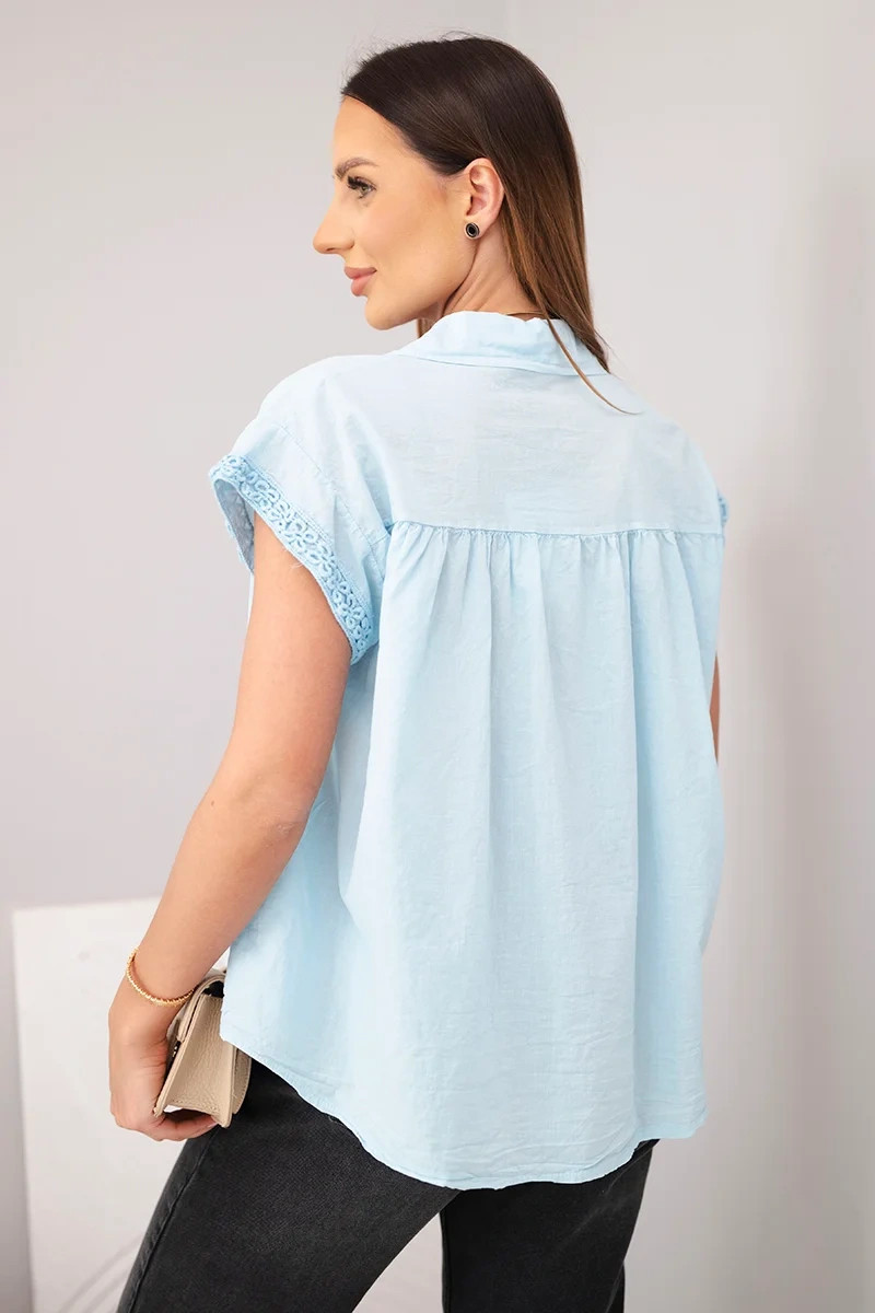 Dámská bavlněná košilová halenka s krajkou a krátkým rukávem modrá