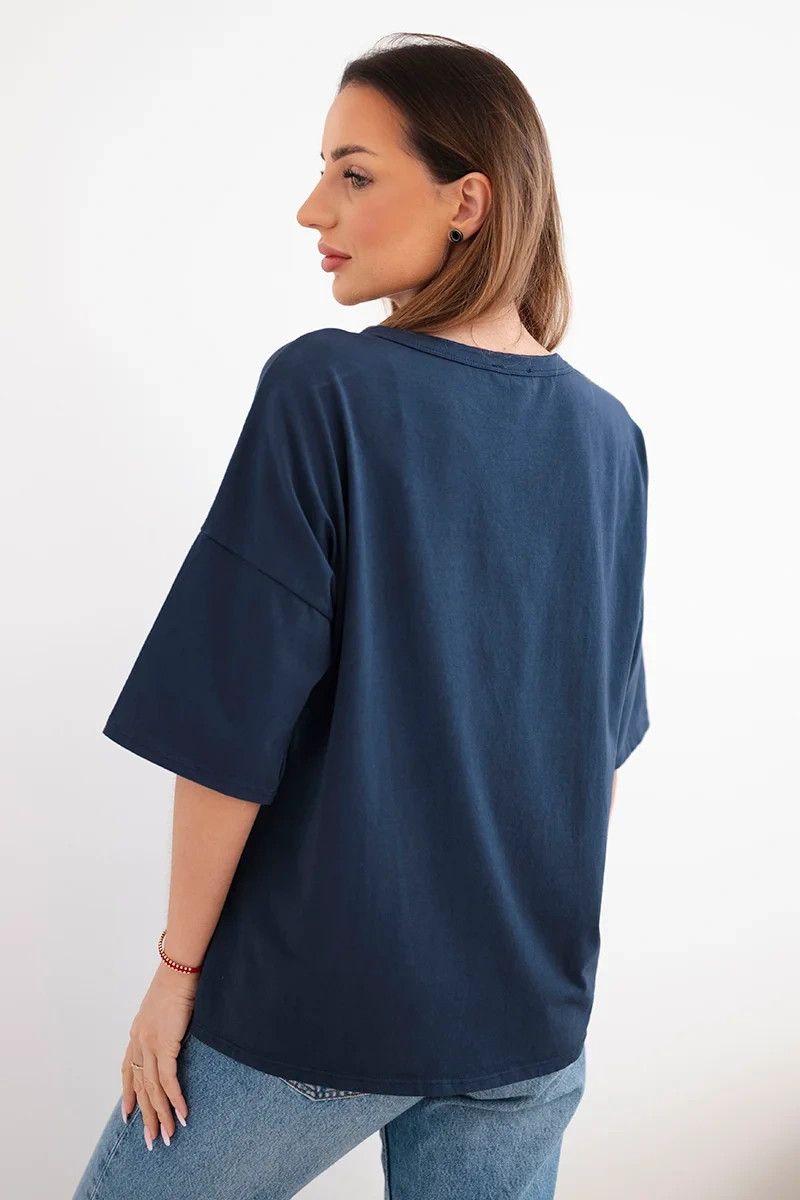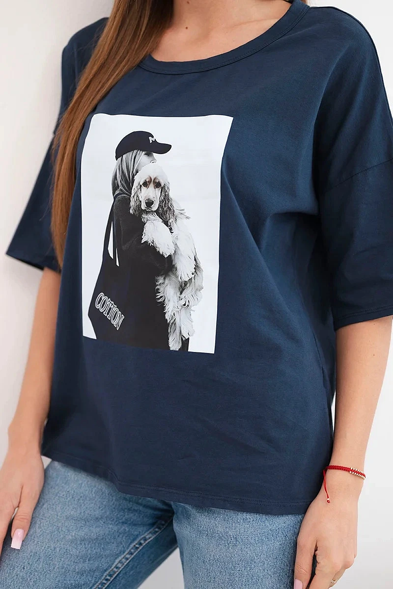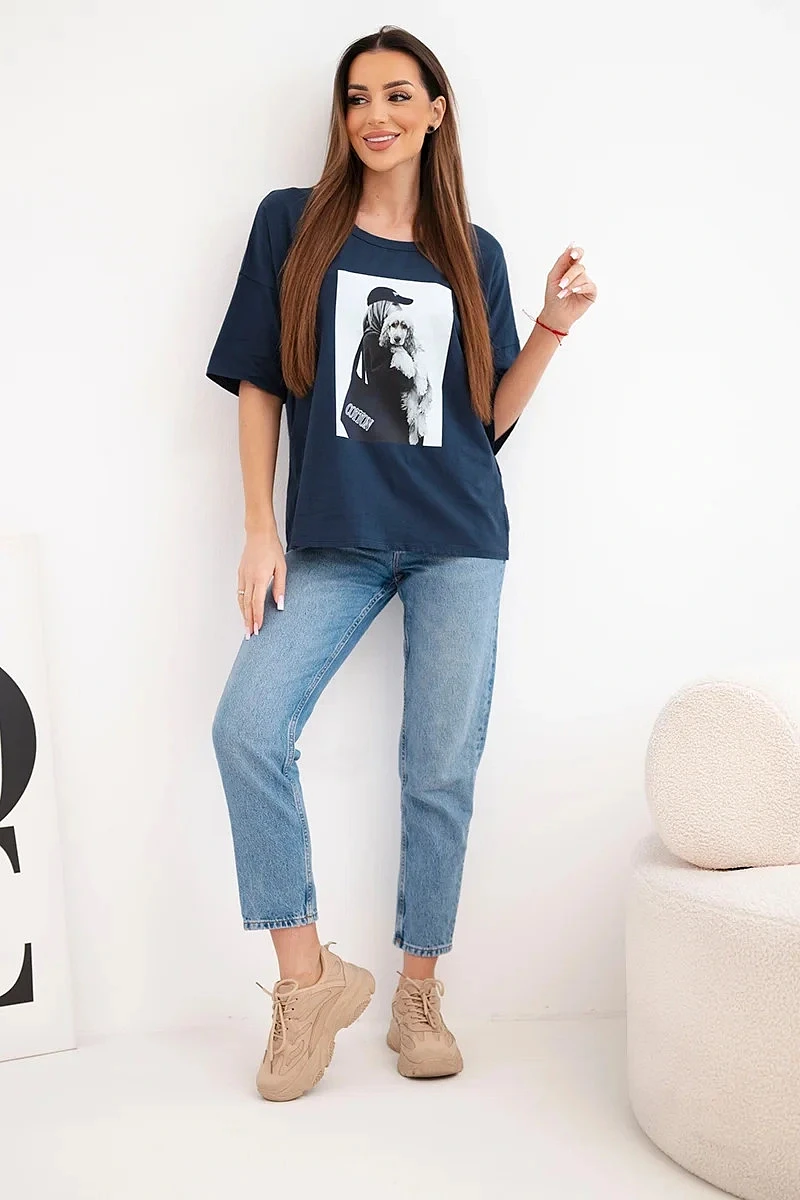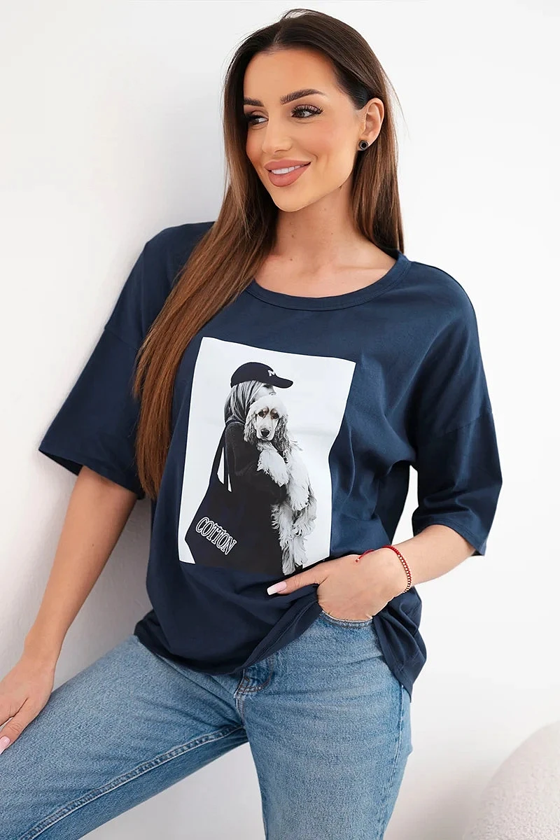 Dámská bavlněná oversize halenka s krátkým rukávem a módním potiskem námořnická modrá