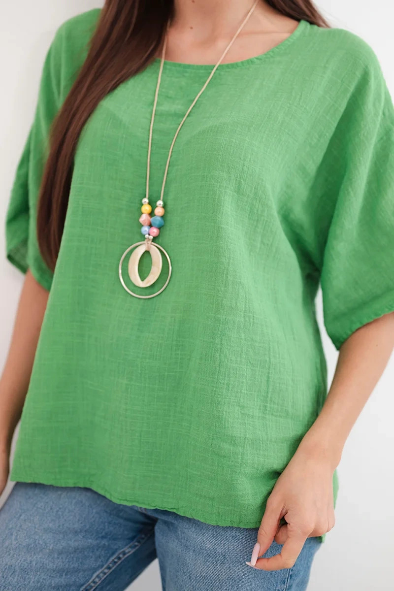 Vyrobená ze 100% bavlny, halenka je lehká, prodyšná a šetrná k pokožce, díky čemuž se skvěle hodí do teplejších dnů. Krátké rukávy a klasický kulatý výstřih jí dodávají univerzální charakter. Další výhodou je jemná struktura materiálu, která podtrhuje přirozený vzhled a dodává celku subtilní lehkost. V balení se nachází také módní náhrdelník, který tvoří stylové doplnění celku a umožňuje vytvořit hotový outfit bez další námahy. Italská výroba zaručuje vysokou kvalitu zpracování a módní design inspirovaný aktuálními trendy.