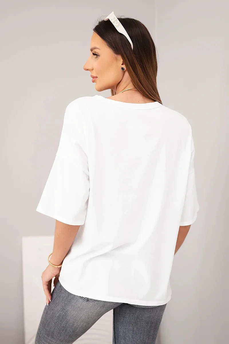 Dámské bavlněné tričko s volným střihem je ideální volbou pro ženy, které si cení pohodlí a módního casual stylu. Model vyniká efektním potiskem vpředu, který dodává celku originální charakter a přitahuje pozornost. Oversize střih způsobuje, že se tričko volně přizpůsobuje postavě a zajišťuje komfort nošení po celý den.