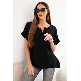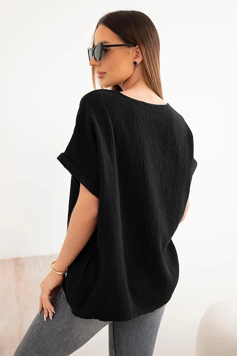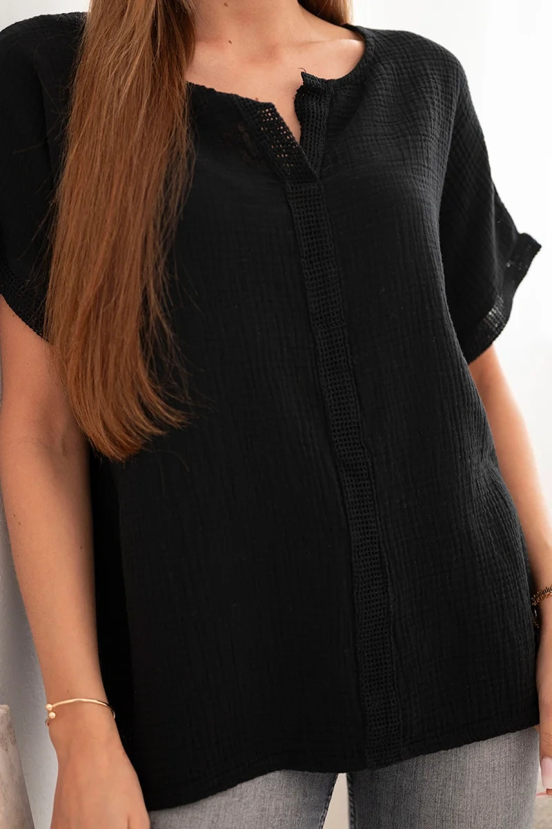 Dámská bavlněná oversize halenka s výstřihem do V a krajkou černá