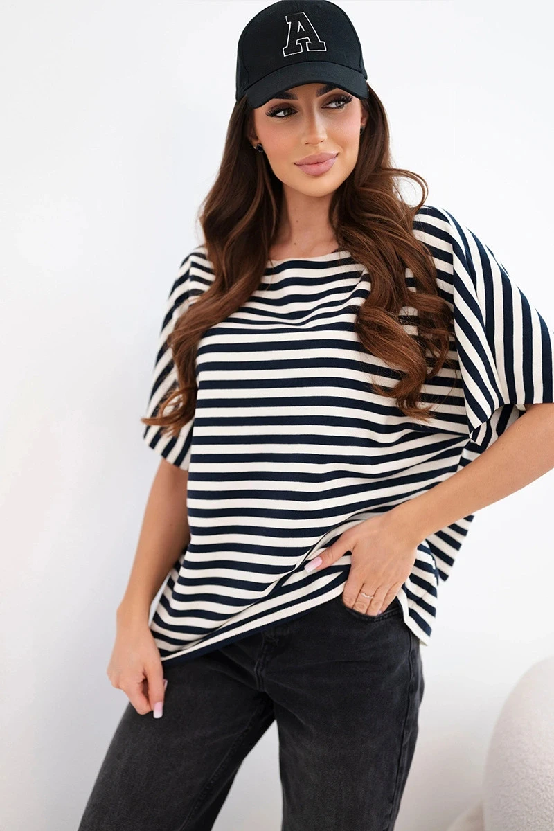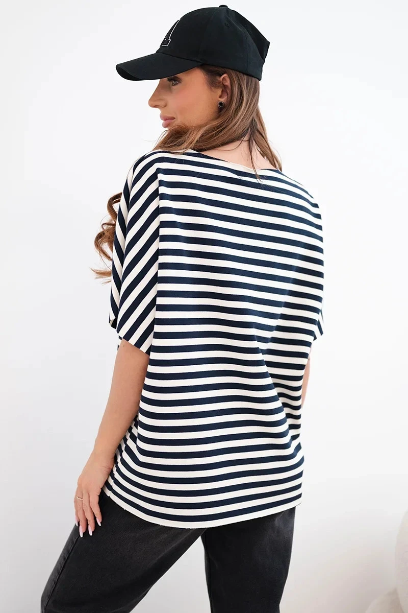 Dámská bavlněná halenka v pruhy je pohodlná a stylová volba ideální pro každodenní outfity. Volný střih zajišťuje volnost pohybu a pohodlí po celý den. Klasický pruhovaný vzor dává halence módní a nadčasový charakter, díky čemuž se skvěle hodí k mnoha outfitům.
