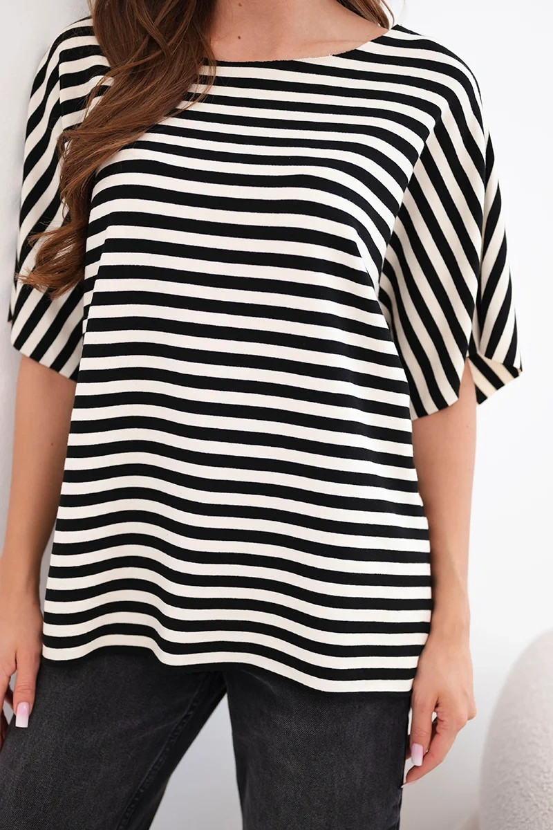 Dámská bavlněná halenka v pruhy je pohodlná a stylová volba ideální pro každodenní outfity. Volný střih zajišťuje volnost pohybu a pohodlí po celý den. Klasický pruhovaný vzor dává halence módní a nadčasový charakter, díky čemuž se skvěle hodí k mnoha outfitům.