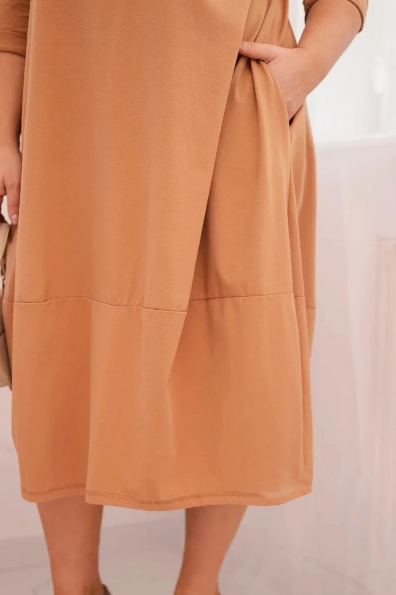Dámská bavlněná šaty Plus Size s ohrnutým rukávem a kapsami camelová