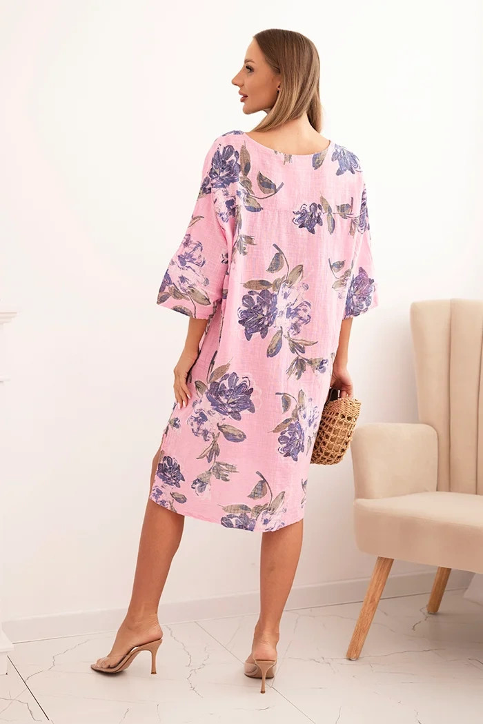 Dámská bavlněná šaty s květinovým vzorem a 3/4 rukávem světle růžová