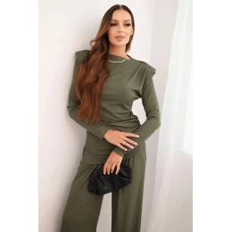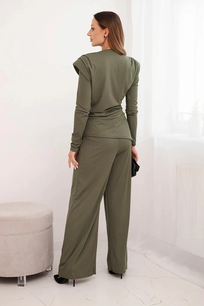 Dámská bavlněná souprava s halenkou a kalhotami s širokým nohavicemi khaki