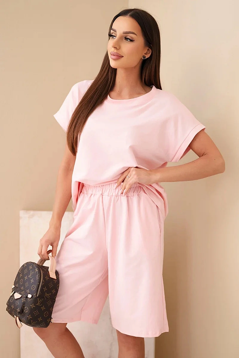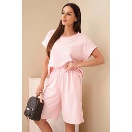 Dámská bavlněná souprava tričko krátký rukáv a kraťasy s gumou v pase pudrově růžová