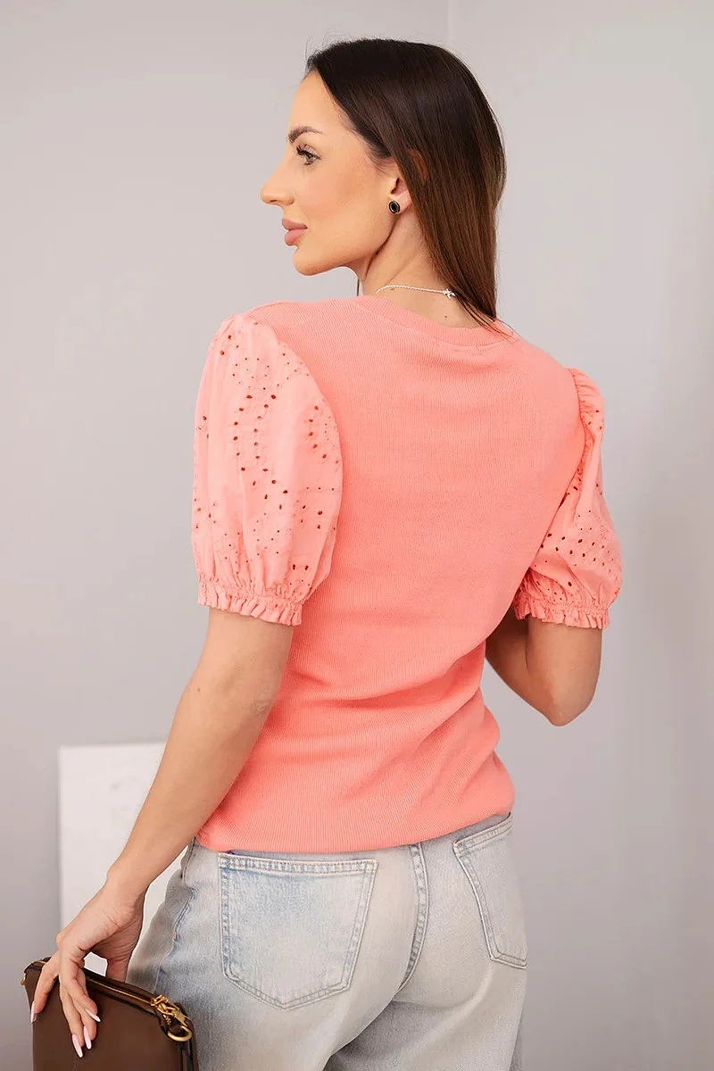 Dámská žebrovaná halenka s nadýchaným rukávem a knoflíčky je skvělou volbou pro ženy, které ocení spojení pohodlí a módního vzhledu. Model se vyznačuje klasickým střihem s lehce přiléhavou linií, která se dobře přizpůsobí postavě. Dekorativní krátké rukávy s ažurovým zakončením dodávají celku jemný a ženský charakter, díky čemuž se halenka skvěle hodí jak na každodenní nošení, tak i do stylovějších outfitů.