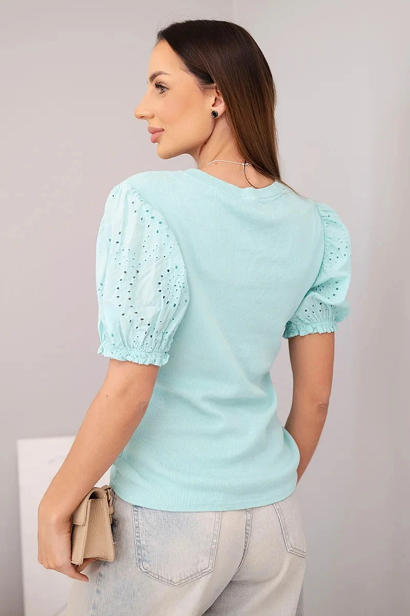 Dámská žebrovaná halenka s nadýchaným rukávem a knoflíčky je skvělou volbou pro ženy, které ocení spojení pohodlí a módního vzhledu. Model se vyznačuje klasickým střihem s lehce přiléhavou linií, která se dobře přizpůsobí postavě. Dekorativní krátké rukávy s ažurovým zakončením dodávají celku jemný a ženský charakter, díky čemuž se halenka skvěle hodí jak na každodenní nošení, tak i do stylovějších outfitů.