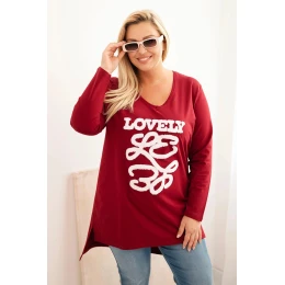 Dámská blůza Plus Size bavlněná s nápisem a V výstřihem bordó