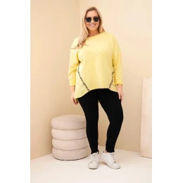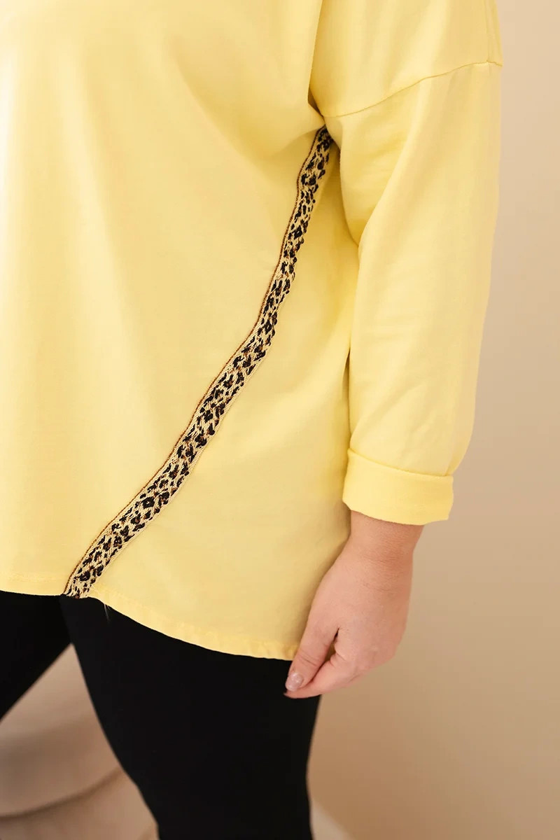 Dámská blůza Plus Size bavlněná s ohrnovacími rukávy a lampasem v leopardím vzoru žlutý