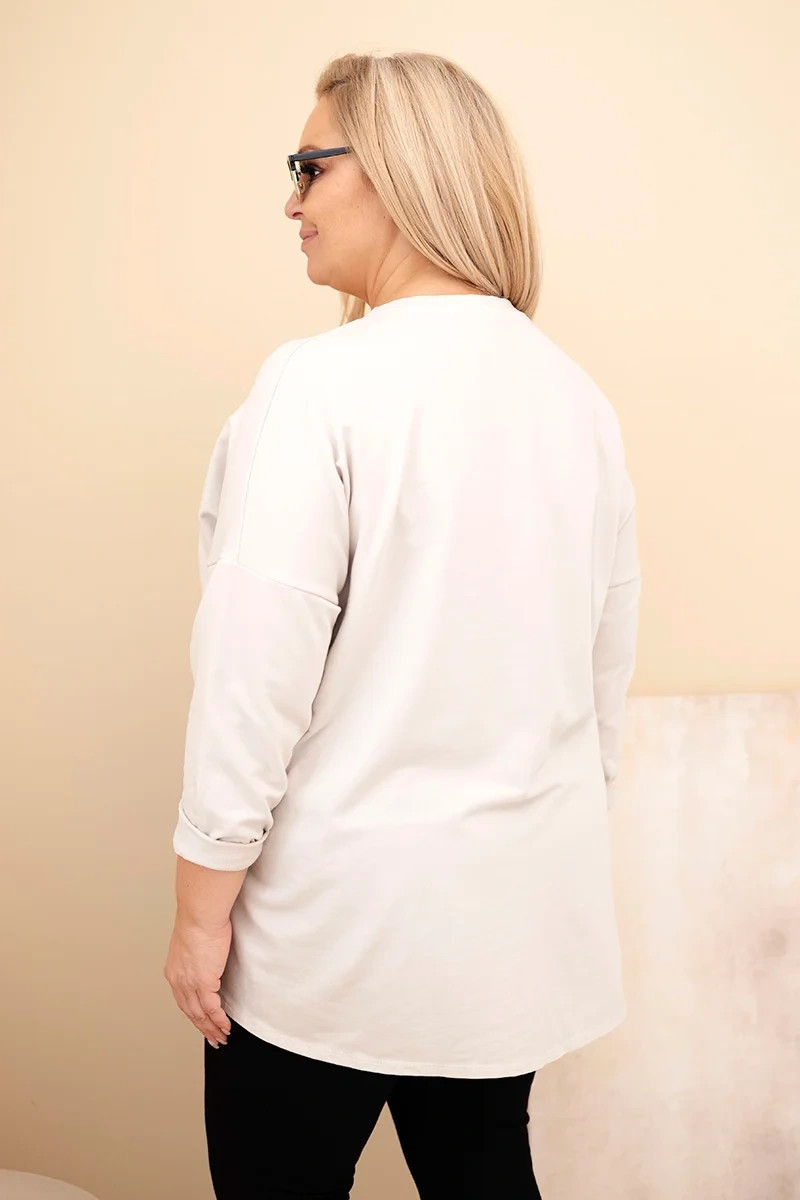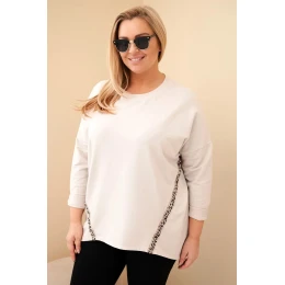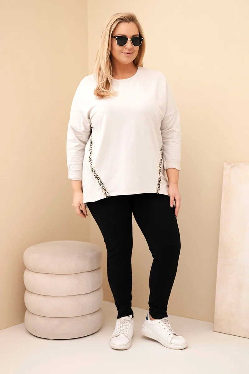 Dámská blůza Plus Size bavlněná s ohrnovacími rukávy a leopardím lampasem béžová