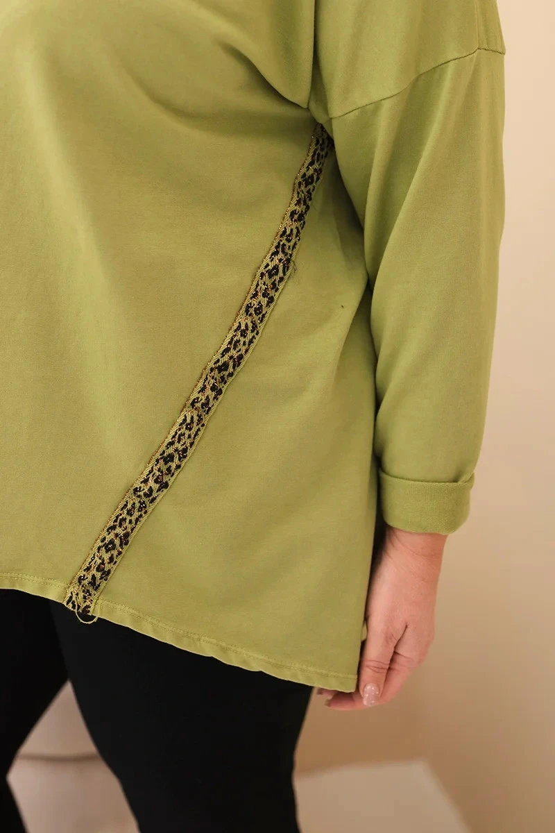 Dámská blůza Plus Size bavlněná s ohrnutým rukávem a lampasem v leopardím vzoru olivová