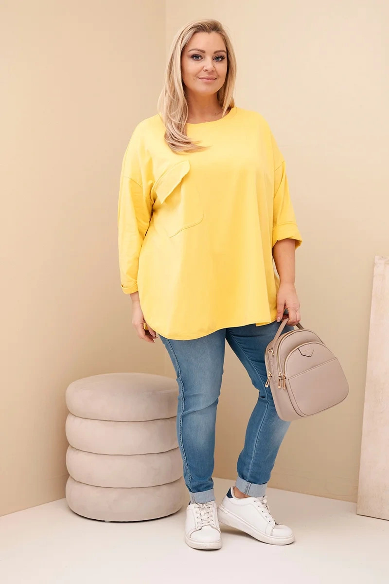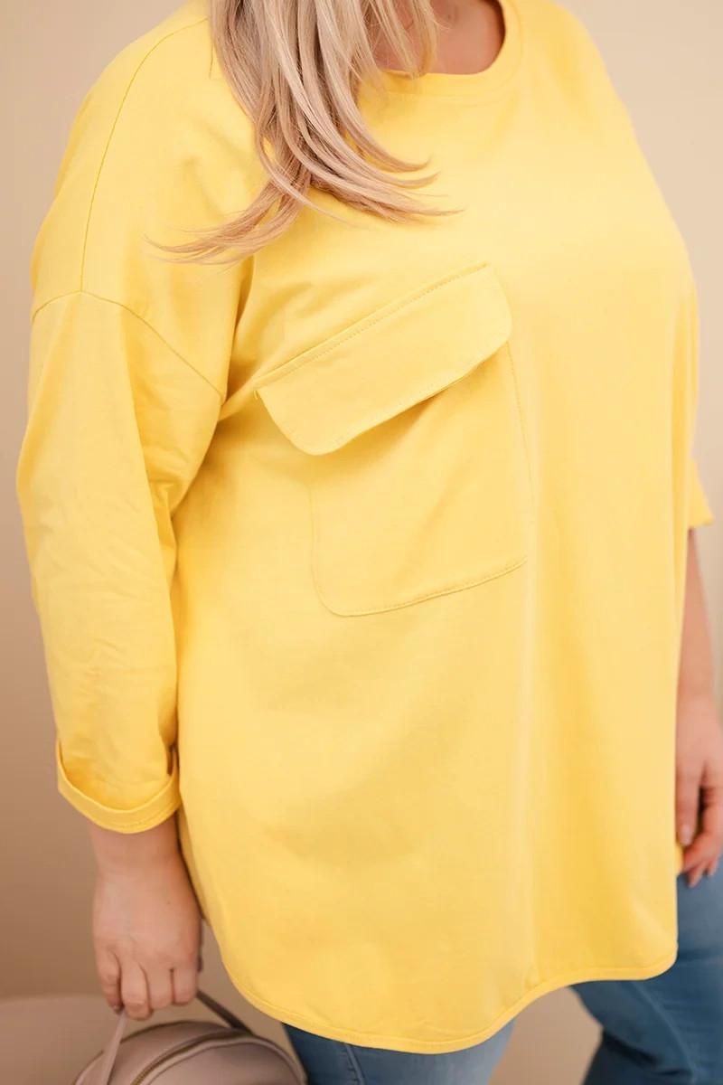 Dámská blůza Plus Size s bavlnou, kapsou a ohrnovacími rukávy žlutá