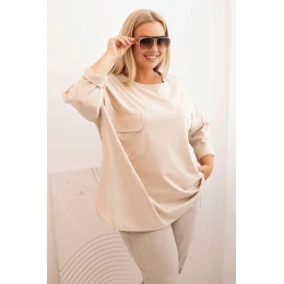 Dámská blůza Plus Size s bavlnou, kapsou a ohrnutým rukávem béžová