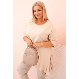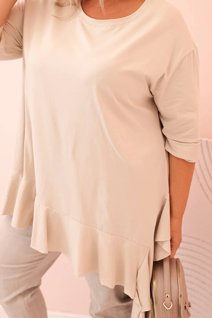 Tento dámský plus size top s bavlnou je výjimečný model, který spojuje pohodlí s módním, ženským akcentem. Ušitý z měkké a elastické bavlněné pleteniny, zajišťuje komfort nošení po celý den. Volný střih neobepíná postavu, a dekorativní volán na spodním okraji dodává topu lehkost a charakter.