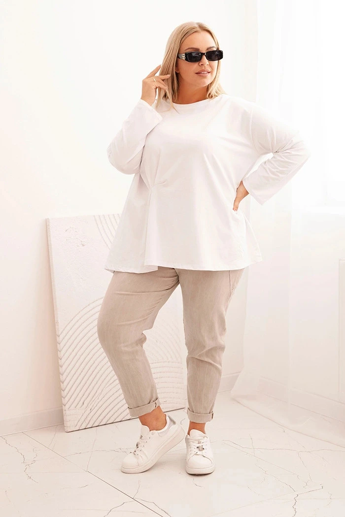 Tato dámská plus size košile s bavlnou je pohodlný a stylový model navržený pro ženy, které si cení komfortu v každodenních stylizacích. Vyrobená z vysoce kvalitní bavlněné pleteniny s příměsí elastanu, je měkká, prodyšná a příjemná na nošení. Volný střih s jemným nařasením vpředu decentně modeluje postavu a dodává celku lehkost.