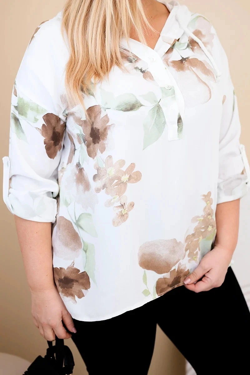 Dámská blůza Plus Size z viskózy s kapucí a květinovým vzorem bílá
