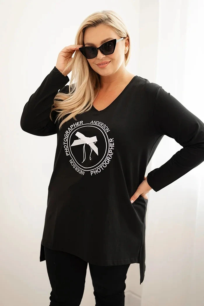 Přední stranu zdobí módní potisk ve streetwear stylu, který dodává celku moderní charakter. Zadní díl je mírně prodloužený, což opticky zeštíhluje postavu a zajišťuje dodateční pohodlí při nošení. Skvělý návrh pro každodenní stylizace – jak k džínům, tak k legínám.