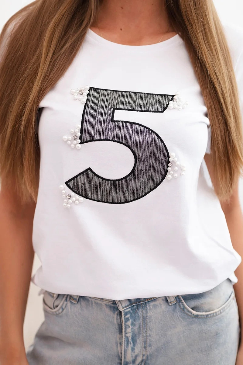 Dámská blůza s krátkým rukávem a efektní nášivkou s číslem „5“ ozdobenou perličkami je ideální nabídkou pro ženy, které mají rády módní a originální akcenty v každodenním oblečení. Vyrobená z vysoce kvalitní bavlny s přídavkem elastanu, zajišťuje pohodlí a správné přizpůsobení postavě.